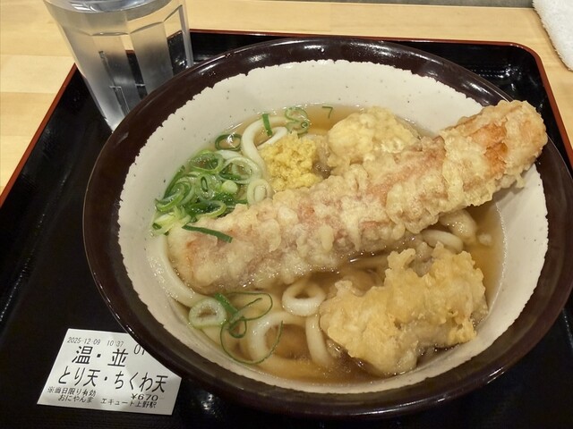 麺は柔らかめでした。とり天はジューシーで美味しかったです。ちくわ天は普通にちくわ天でした。あげ玉と生姜のセルフサービスがありました。