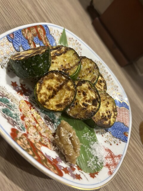 お刺身盛り合わせ、ズッキーニ、とうもろこし、串で鶏をハツ、キモ、皮、ぼんじり、ナスの茗荷のおひたし、ポテトフライを注文。