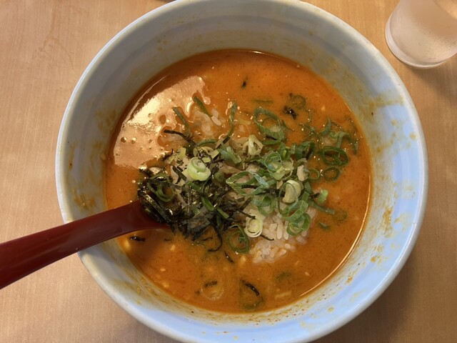 着丼した超爆タンタン麺は、普段頼む爆烈タンタン麺に比べ、スープが赤く、山椒が多めに掛けられています。