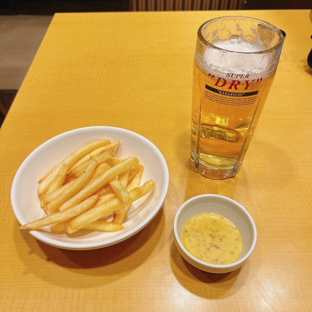 入店してからまず、「ちょい盛りポテトとスーパードライ(ジョッキ)のセット」と、期間限定博多グルメシリーズの「牛もつ焼き(単品)」を発注。ポテトと牛もつ焼きをつまみながらビールを飲んで一杯目は終了。ジョッキ2杯目と共に「博多明太もつ鍋《あごだし醤油》【ごはん付き】もつ1.5倍」と追加トッピングの「ニラ」を発注。着鍋してからスタッフさんが鍋の下の固形燃料に着火、しばし待つと鍋がグツグツ煮えてきました!熱々のもつや野菜を頬張って冷たいビールで流し込むと最高です。