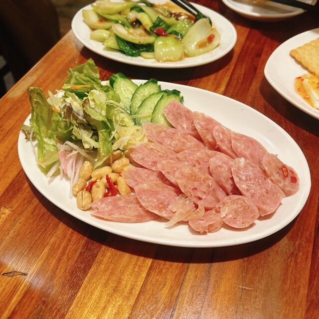 タイ北部チェンマイの郷土料理らしい「ネームソーセージ」スライスされたソーセージに刻み生生姜を載せて食べるとビールが進むヤツです