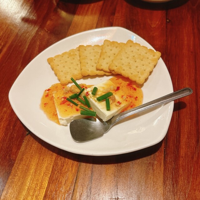 クリームチーズにスイートチリをかけてクラッカーに載せていただきます。クリームチーズとスイートチリがこんなに合うなんて!