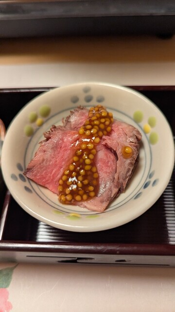 温かい金時人参のすりながしから始まり、おばんざい3種。このおばんざいのローストビーフに甘めのマスタード乗ったのが最高に美味しい!!えびいもとわさび菜は京都らしい優しい味付け。