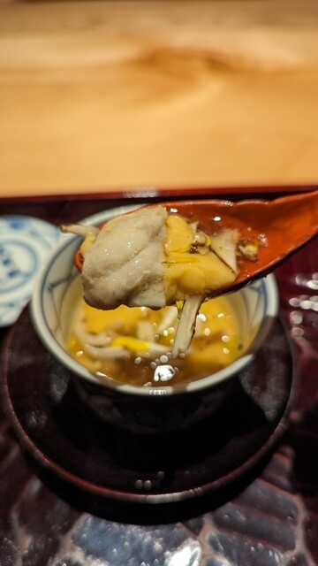 コース初っ端から特製の醤油と柑橘を混ぜるポン酢作り、ふぐのコンソメスープをワイングラスに入れ香りを引き立たせる工夫。