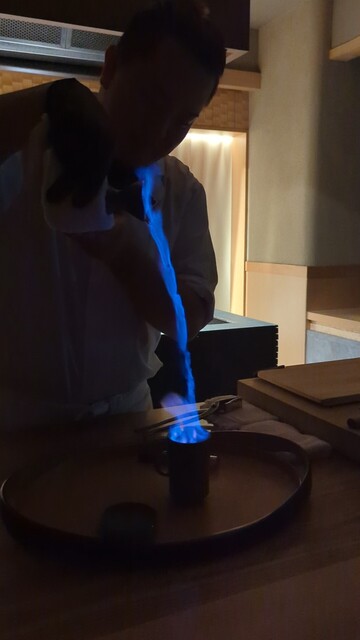 冷酒はとても珍しい。優しい舌触りで飲みやすいながらもヒレの香りも良いお酒でした!ヒレ酒の炎演出も必見!!