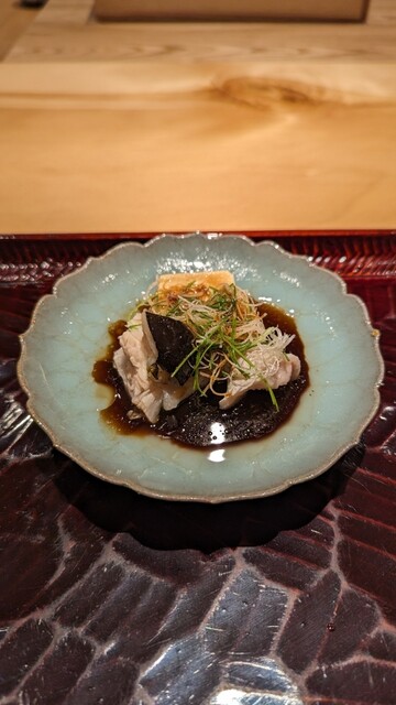 くちばしの料理では目の前で熱々のネギ油をかけ、特製醤油をかけて食べる中華風。