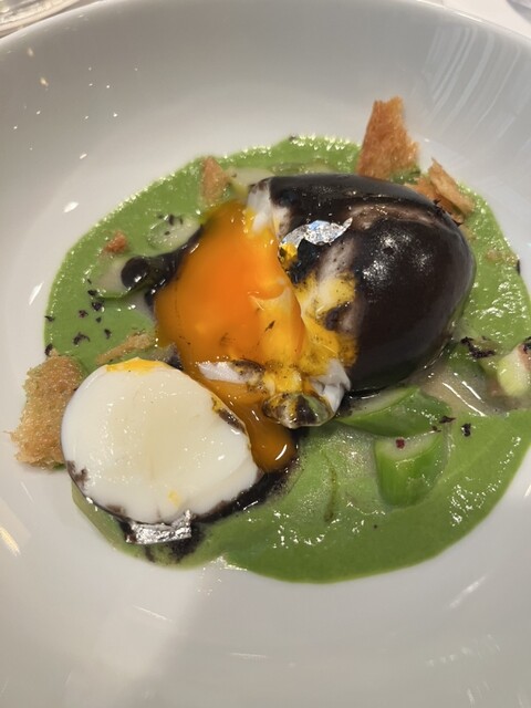 比内地鶏の卵の燻製。すごく独創的!燻製だけど、黄身はトロッと溢れ出して、アスパラガスのソースとからめると、もう最高!