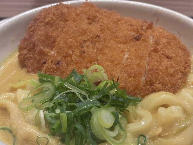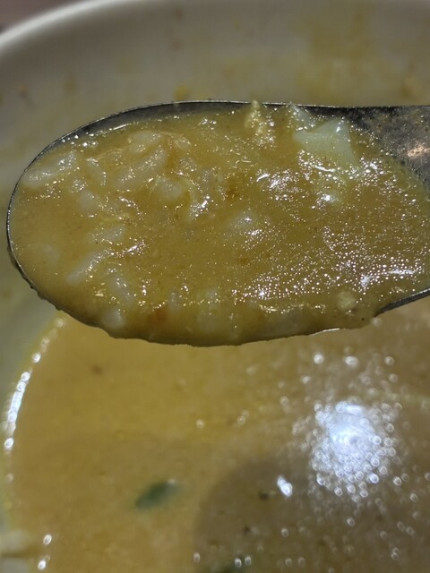 さて、肝心のカレーうどんは、熱々のスープにモチモチの腰のある麺、特に冬場に食べるとめっちゃ満足感があります。最後にご飯をスープに浸して雑炊にして食べると小さな幸せを感じられます♪ 今回はカツカレーうどん…うーん、B級の王道ですね!