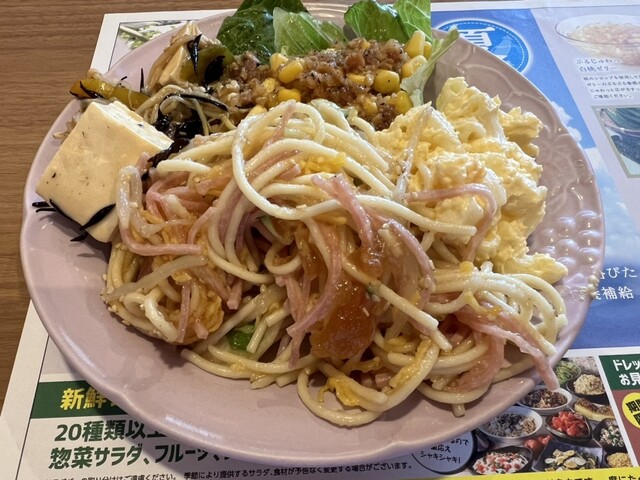 サラダバーは、小松菜としめじのポルチーニクリーミーパスタと