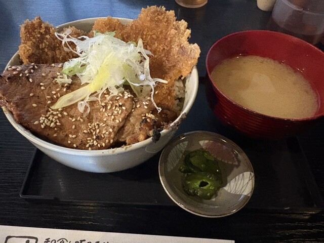 豚味噌とわらじかつのダブルを注文しました。普通盛りでもお腹一杯になります。お味噌汁とお新香がついてます。