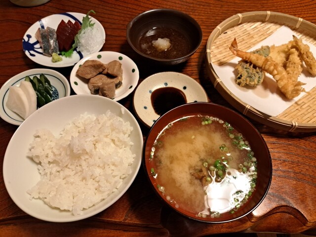 天ぷら刺身定食1200円は、期待以上の美味しさ。お刺身は弾力のある身で、赤身の方はひと手間加えられているのか、それとも熟成されているのか、ねっとりとした感じ。