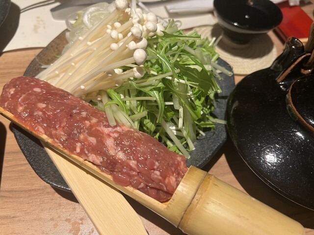 鴨の油で春菊と椎茸を焼いで大根おろしと醤油でいただきましたが、これがおいしい!追加注文しました。鴨のしゃぶしゃぶと野菜のあと、締めは雑炊にしました。