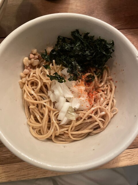だしそばしょうゆ、味玉、ライス小、和え玉ハーフを頂きました。スープは煮干しの旨味が強く、醤油がグンと効いており美味。自家製麺は独特な食感で良い啜り心地。味玉は味しっかりめで、丁度良い半熟具合。チャーシューは味が濃く良く染みて柔らかく旨い。青菜の渋みがラーメン全体のバランスをより昇華させている。和え玉は味がついてるためそのまま頂ける。ハーフでもかなり満足できる。しおとしょうゆどちらも美味しく、甲乙付け難い。再訪時はしおを頂きたい。