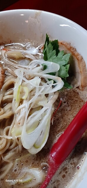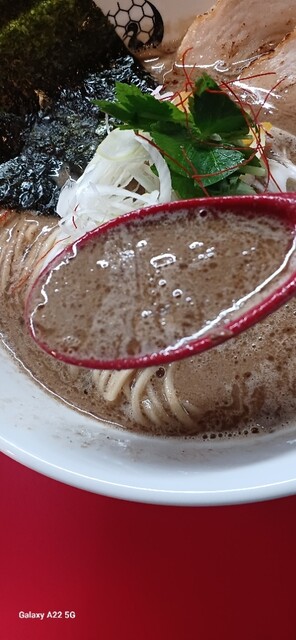 濃厚な魚介スープは、ねっとりとし、平打ち麺がスープによく絡み、香ばしく焼かれたチャーシューに粗挽きの胡椒をふりかけ、 麺と合わせて いただく。