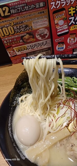 濃厚な鶏白湯スープが麺に絡み、