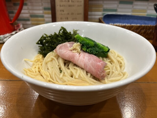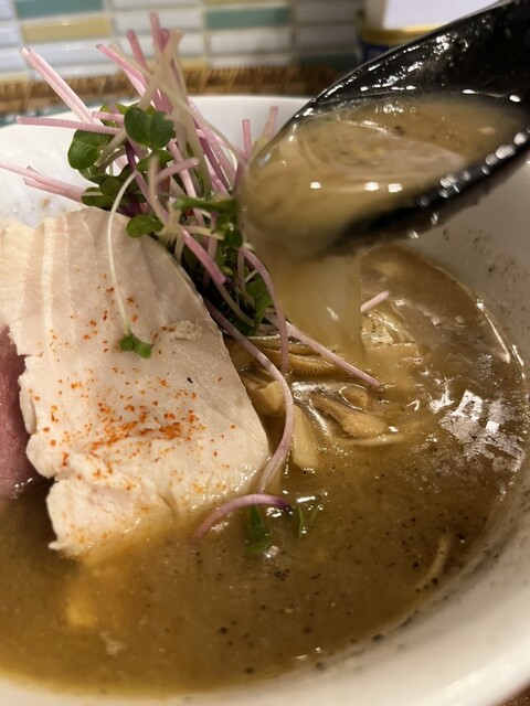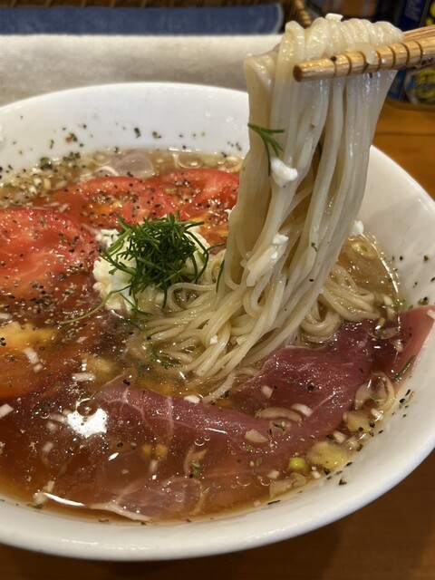 麺はモッチリトピもジューシーなレアチーシュ、鶏チャーシュー、玉子、カイワレ、レモン、メンマ、キノコ等…美しく豪華