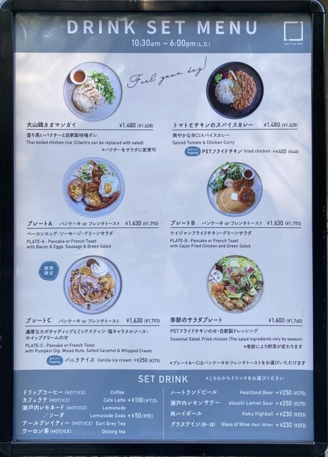 セットメニューと飲み物の一覧、プレートA、B、Cはパンケーキor フレンチトーストを選択