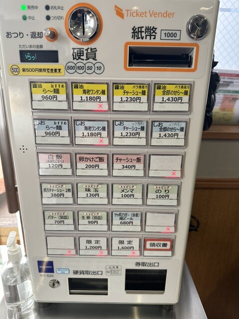 やはり、並びますね。この日はとにかく日差しがあり、きつい、日傘っぽいのが置いてあるので、お借りしました!待つこと1時間15分、中に入って券売機で、食券を購入。