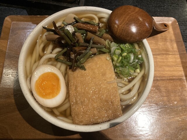 山菜、きつね、煮卵の乗ったうどんと炊き込みご飯の菊セット(900円)にしようか、と思ったがご飯が品切れみたい。