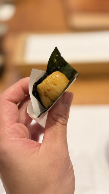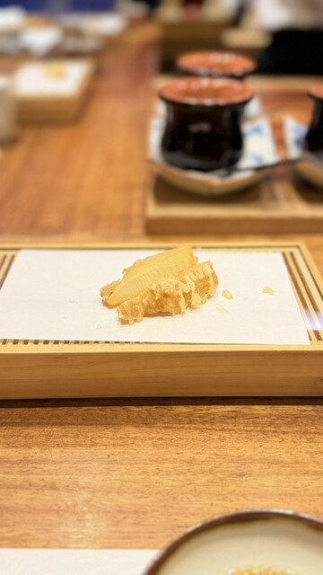 序盤の車海老やたけのこ、カニのシソ巻きなど、素材の良さをまっすぐに感じさせる天婦羅が続き、油の軽さと温度管理の正確さに驚かされます。特に印象的だったのが、海苔天に漬けまぐろ・雲丹・キャビアを重ねた一品。天婦羅でありながら、まるで一皿の料理として完成されており、口に入れた瞬間に海の旨みが層になって広がります。