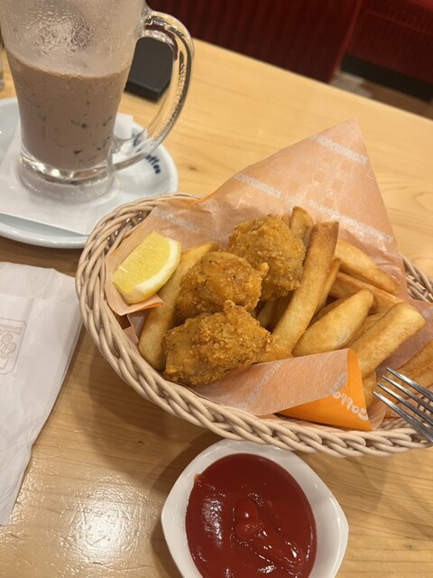 今日はチキン照り焼きサンドみたいなのと、ナポリタンセット、シロノワール、メロンソーダを頼みました。サンドイッチは、キャベツや、ソースがたれてきて、おいしいけど、ちょっと食べづらかったです。ナポリタンとシロノワール、メロンソーダもおいしくて満足でした。