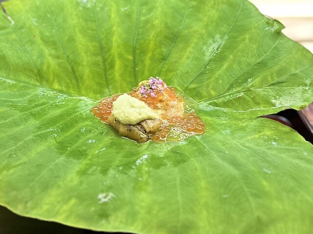 ✳︎北海道噴火湾の毛蟹と愛媛の赤雲丹いくら トマトを濾過して色素を抜いたジュレ 熊本の焼き赤茄子 芋茎 味緑という枝豆のペースト ずんだ