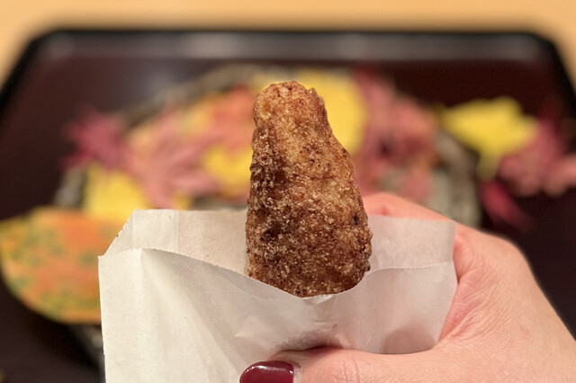 お皿の上での紅葉拾いをした後、紙袋に入ってた海老がクリスピーで美味しかったです。演出も素晴らしい。