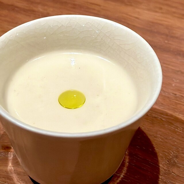 バスク地方の伝統的なスープでネギのポタージュ スペインの塩漬け鱈白子 群馬県産下仁田葱のオイル