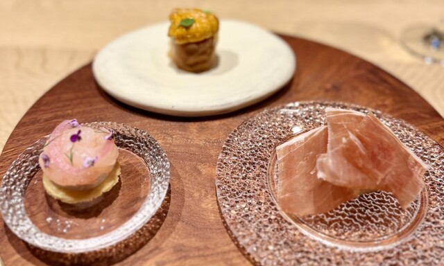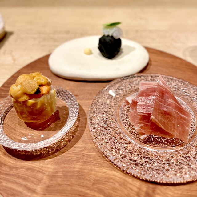 ・北海道無添加雲丹 パイの中にスペインのピキージョピーマンのムース きぬ青海苔