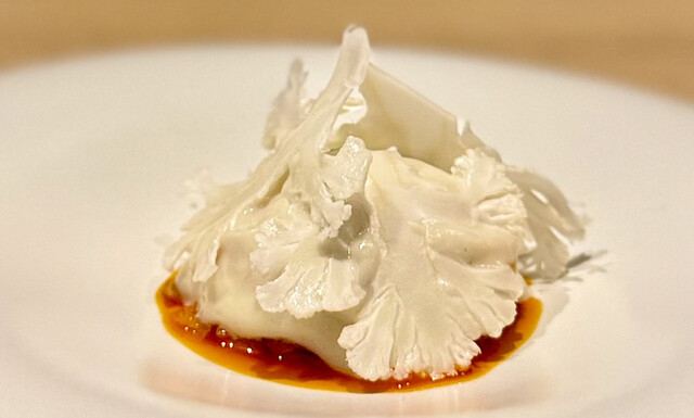 冬瓜 鶏のお出汁とスモークしたパプリカパウダー 上に松の実クリーム ギンディージャという青唐辛子の酢漬け ライムの皮
