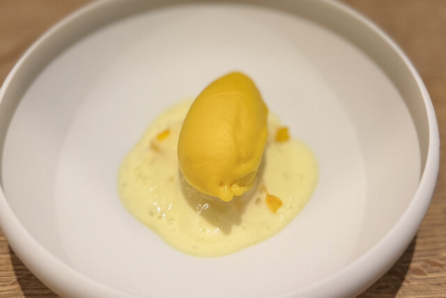 *宮崎マンゴーアイス 新生姜とスペインのサフランのムース 下にココナッツのクリームとフレッシュなマンゴー