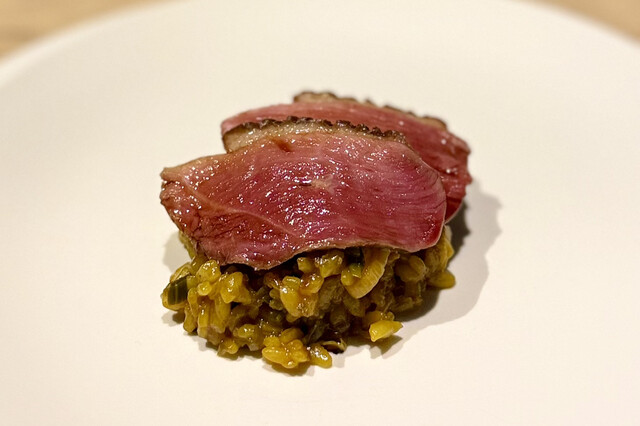 北海道産鴨のパエリア ポルチーニのお出汁 ペドロ・ヒメネス (スペインのシェリー)のソース