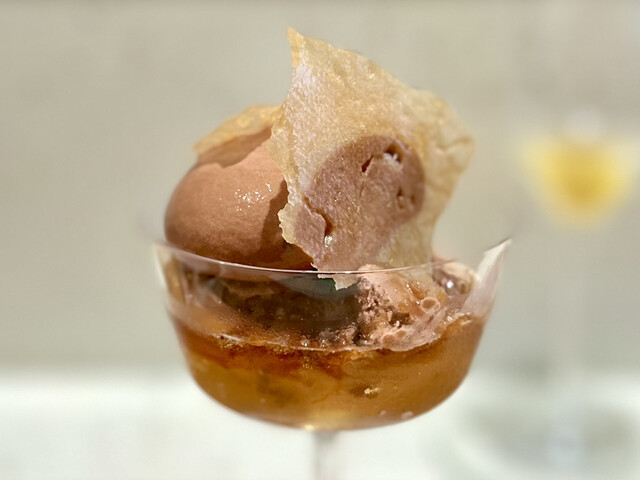スペシャリテ カカオのソルベとエスプーマ コーヒーのグラニテ カカオのチュイール