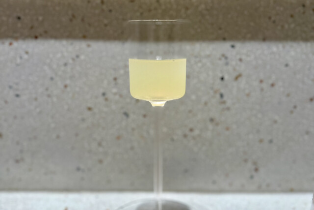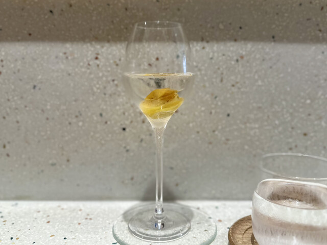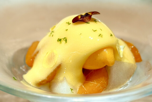 *新潟県佐久間さんのルレクチェ柚子の香り モスカートダスティのジュレ、洋梨の泡、柚子の皮のコンフィとメレンゲ