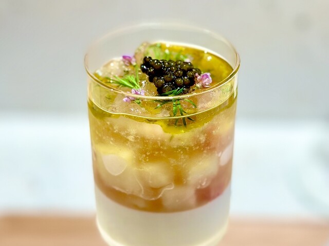 ✳︎桃/雲の上トマト/甘エビ/モッツァレラムース/オリーブオイル/キャビア(オシェトラプレミアム)
