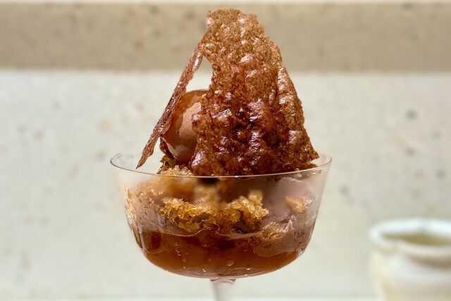 エクアドルのアリバカカオのソルベとエスプーマ かき氷 コーヒーのグラニテ カカオ豆を水出しした寒天カカオのパウダー カカオパルプのチュイル
