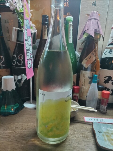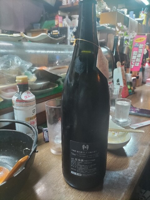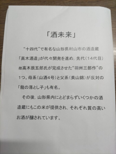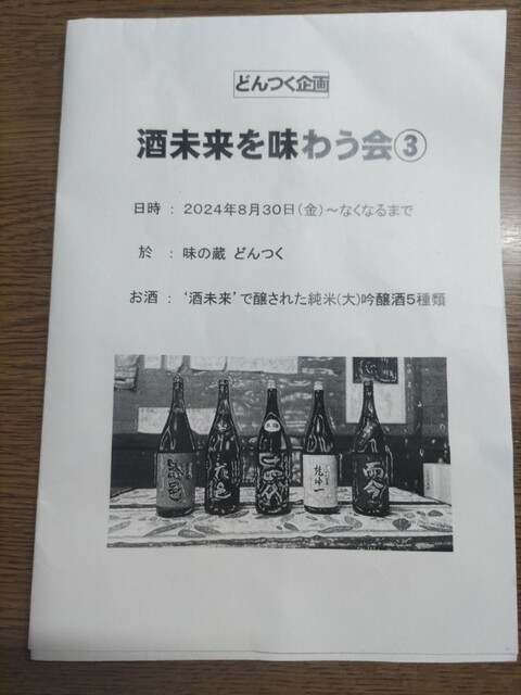 いつも通っている大崎市古川のどんつくへ。カウンターに名簿とお酒の写真のパンフが置いてあって「ありゃあ、酒紀行研究会だったか」と。どんつくでは、年に2回程度、お酒の会として「酒紀行研究会」が行われています。その時々によってテーマがあり、同じ銘柄の比較や、蔵元さんを呼んだり、冷蔵庫開放なんてのもあります。今回のテーマは酒米の酒未来で作ったお酒がテーマのようです。要予約で今回はお酒と料理で8000円です。