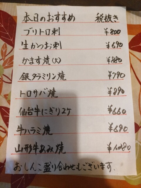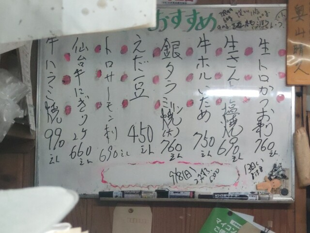 私は予約していなかったので通常のメニューと本日のおすすめから、最初にビールを頼んで、枝豆、サンマの塩焼き、奴を注文。その後、冷蔵庫からおサケと牛にぎりを注文してチビリチビリとやりました。サンマは今シーズンはじめてですが、まだ太くなっていないですね。去年はあんまり出回らなかったけど今年はどうなのかしらん。テレビでは大曲の花火大会。まだまだ暑いけど、季節は確実に秋に向かっていくのですね。