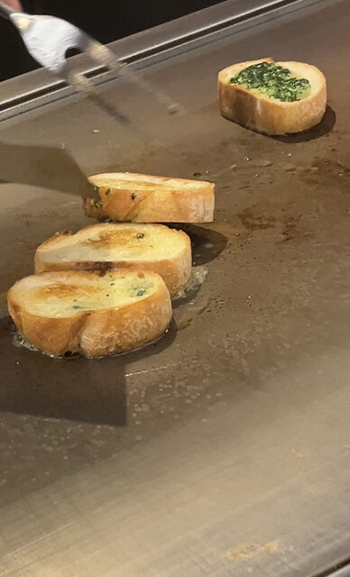 ガーリックトーストも鉄板でこんがり焼いてくれますコクのあるバターの風味と香り高いガーリックのハーモニーサックサク感も堪ら〜ん