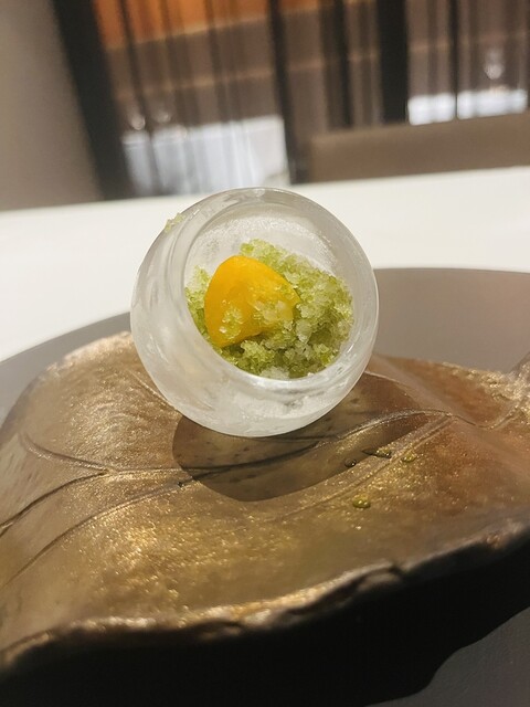 ➡️大阪湾でとれた新鮮で若干レア食感の桜鯛に大阪産の蕗と濃厚ソースが添えられた一品。何か蕗っぽくないな〜と思いきや、上の蕗にはホタルイカが仕込まれていた