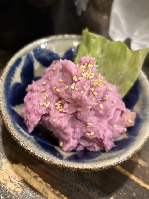 その日たまたま紅いもポテトサラダがあって、珍しいので頼んでみたんですが、これまた美味しい!!