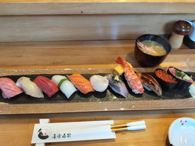 いつも混んでいるランチタイムに、この日は運良くすぐに入店。上きつね(12貫)と喜常ミニ丼セットを注文。