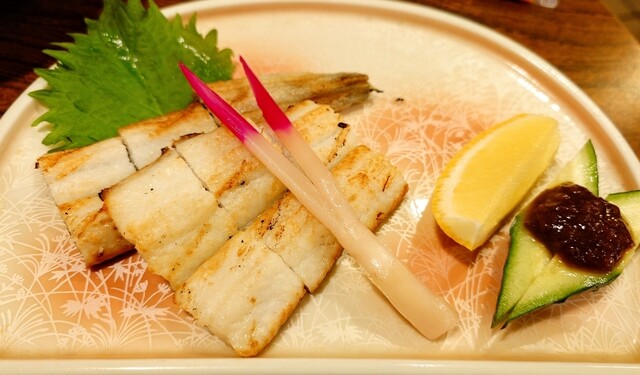 カウンター席正面のホワイトボードに「穴子の一夜干し」のメニューがあったので、すぐに注文しました。ここ大田市は「大アナゴ」を特産品としています。このお店のアナゴが地元のものか確認していませんが、ボクはアナゴの白焼きが好物なので全然問題はありません(笑)