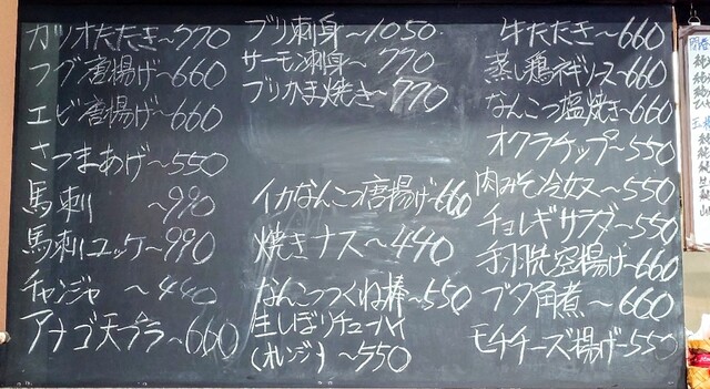 さて、ボクは今回もたくさん料理をいただきました。定番メニュー「楽コロッケ」、ボクの好物「馬刺」、「アナゴ天プラ」、黒板に書いてある料理等すべておいしいかったです。