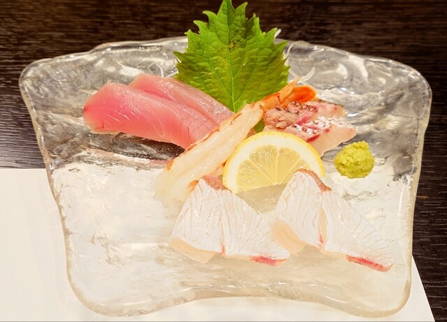 刺身の盛り合わせ①(ヨコワマグロ・赤エビ・鯛の湯引き・カンパチ)