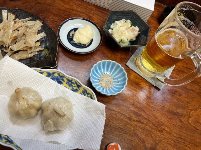 突き出しのポテサラ、ニンニク丸っと揚げ、明太ちくわ揚げ、エイヒレをオーダー