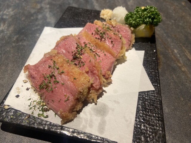 味噌ユッケもお洒落な盛り付けでコーンの中身に卵黄が入っています。逆さにしたら卵黄が出てきてコーンを崩して頂きます。味もとて...