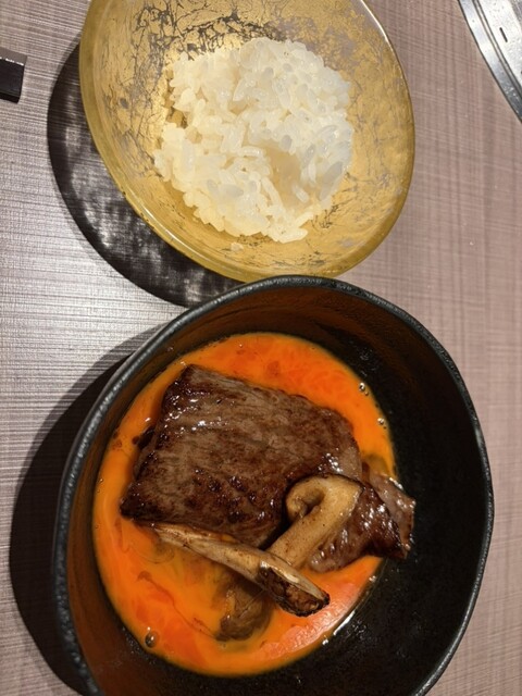 和牛サーロインのすき焼きは目の前で調理して頂きます。牛脂をひき、和牛と松茸を程よく焼いたら割下を入れ、松茸もほぼ半分入った贅沢過ぎるすき焼きの完成です。青森県産真っ赤卵の日本トップレベルで濃厚な卵と一緒に絡める最高峰のすき焼きです。