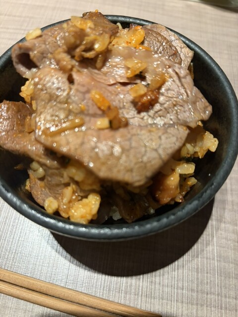 ビビンバについては一般的にはナムルやキムチが多く入ってますが、盛り付けほぼお肉で構成されたうし松さん特製のビビンバです。味も焼肉好きにはたまらない。卵は真っ赤卵です。
