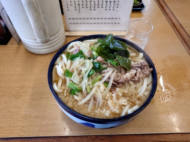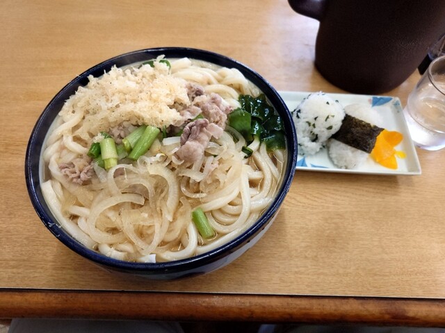 銘店町川で肉うどん三玉天かす入り、おにぎり2個、830円也